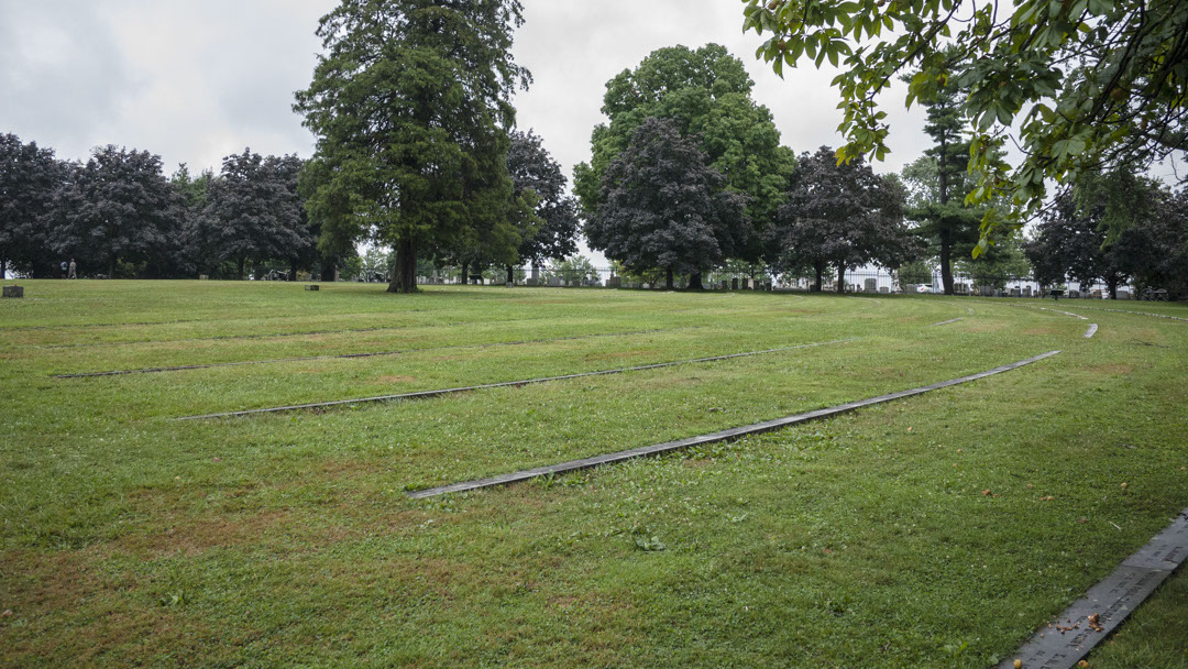 National Cemetery markers with Evergreen Cemetery in background - July 2012